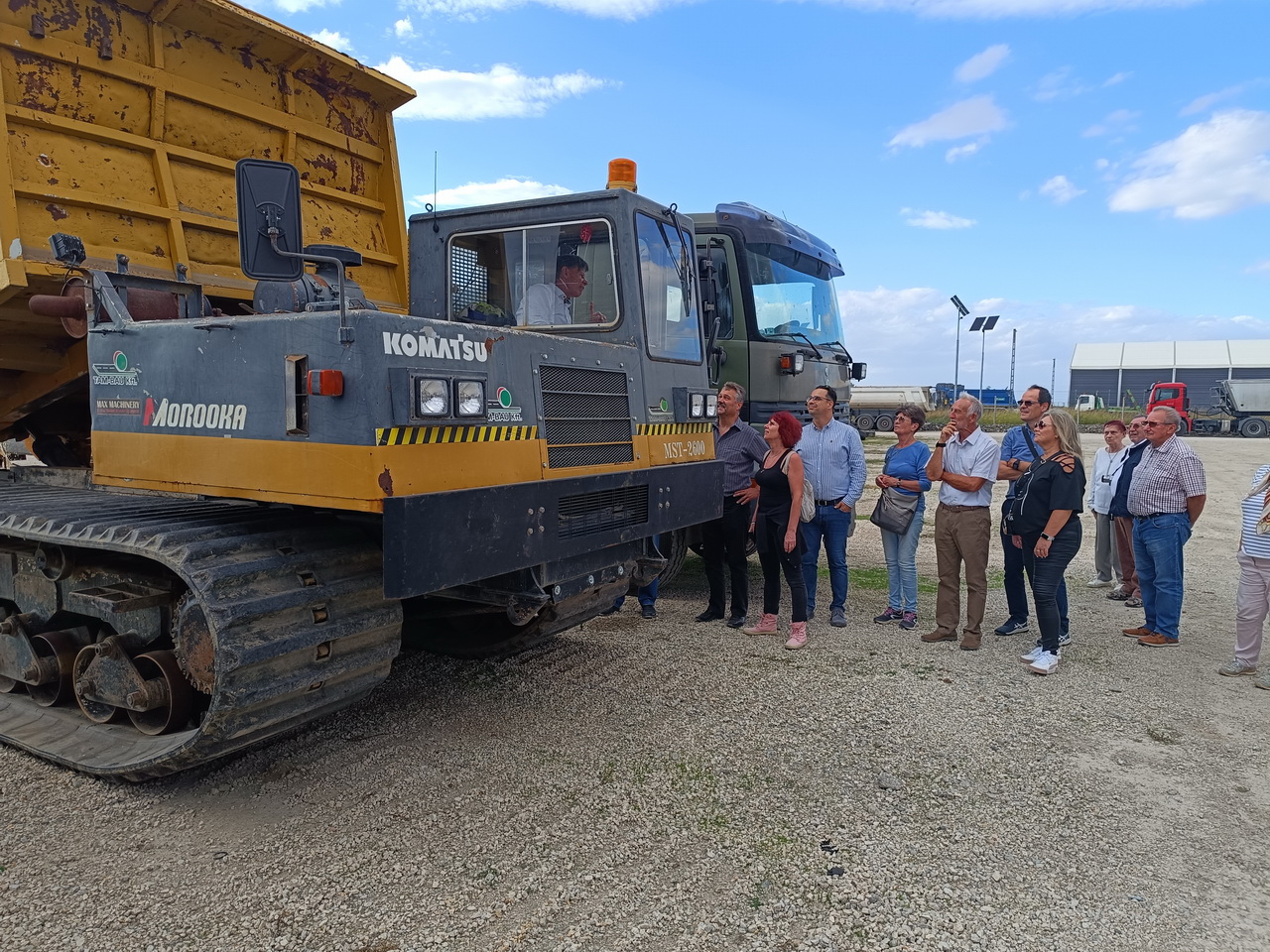 Ezt követően egy sétával egybekötött vezetésen ismerkedtünk meg működés közben a "térkő-tojó" géppel, a rendezett, kulturált helyszínekkel, a csarnokban tárolt adalékanyagokkal, a betonkészítés vezérelt működtetésével, az iszapkotrásban élenjáró gumi-lánctalpas kotrókkal ( melyet Kólya úr a jelenlévőknek személyesen működésbe is hozott ).